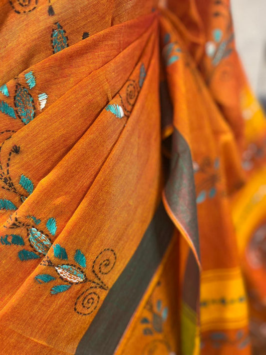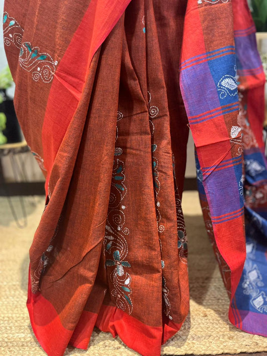 Terracotta Twist | Cotton Kantha Stitch Saree