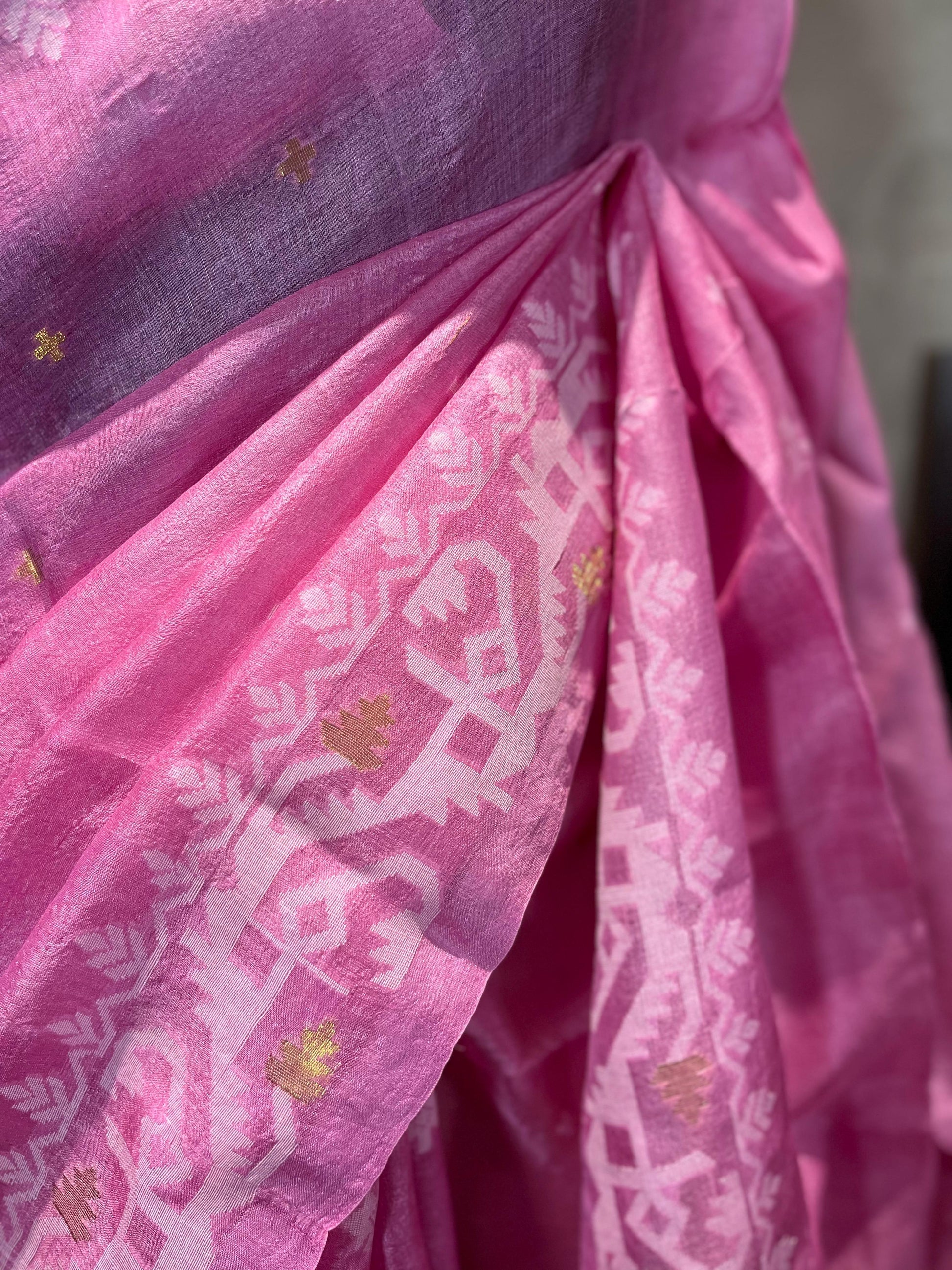This premium tussar silk saree in a soft light pink shade showcases intricate handwoven jamdani work, adorned with elegant golden motifs. The delicate craftsmanship and luxurious fabric create a sophisticated ensemble perfect for celebrations and formal occasions, reflecting both tradition and refined style.