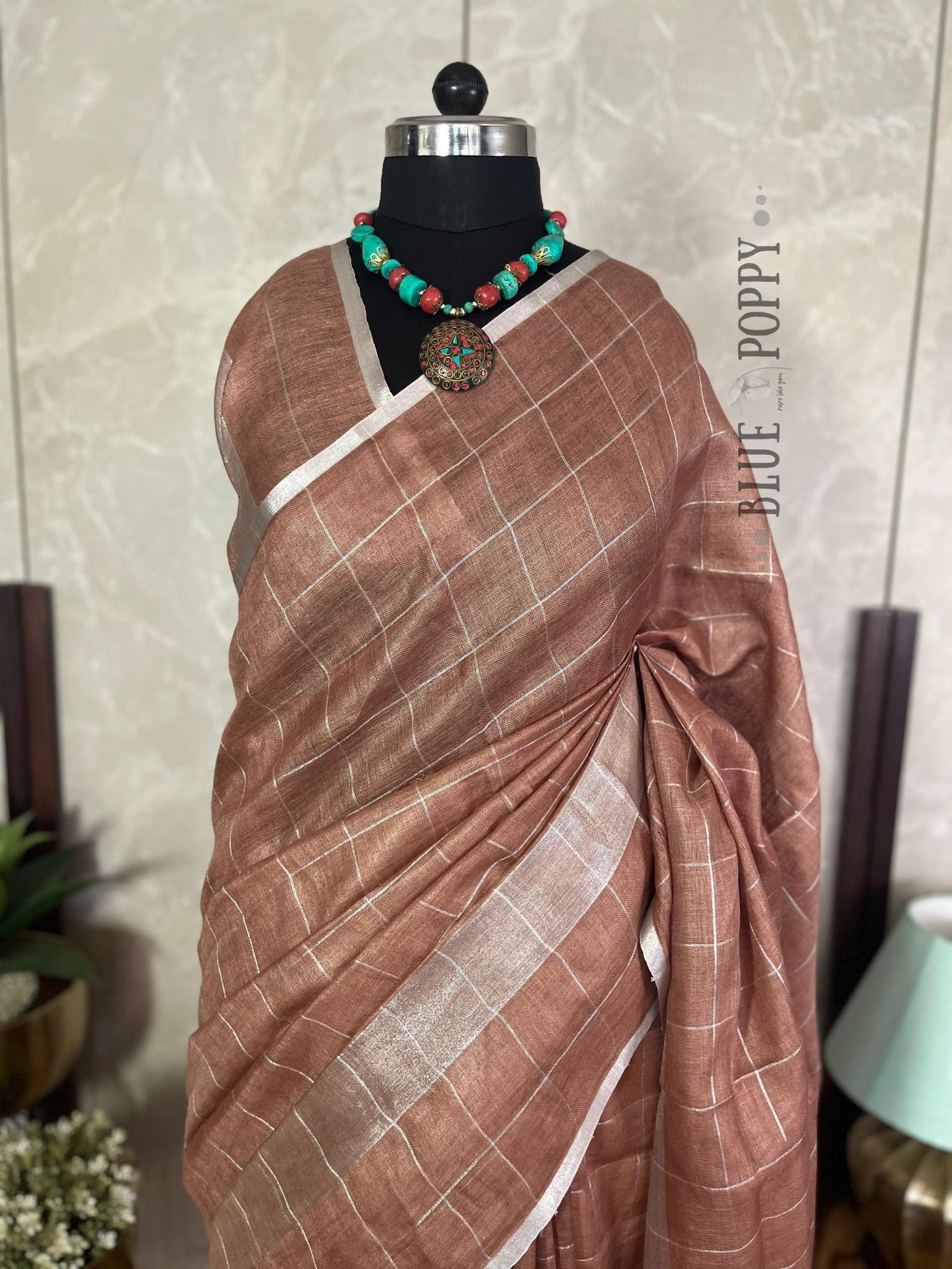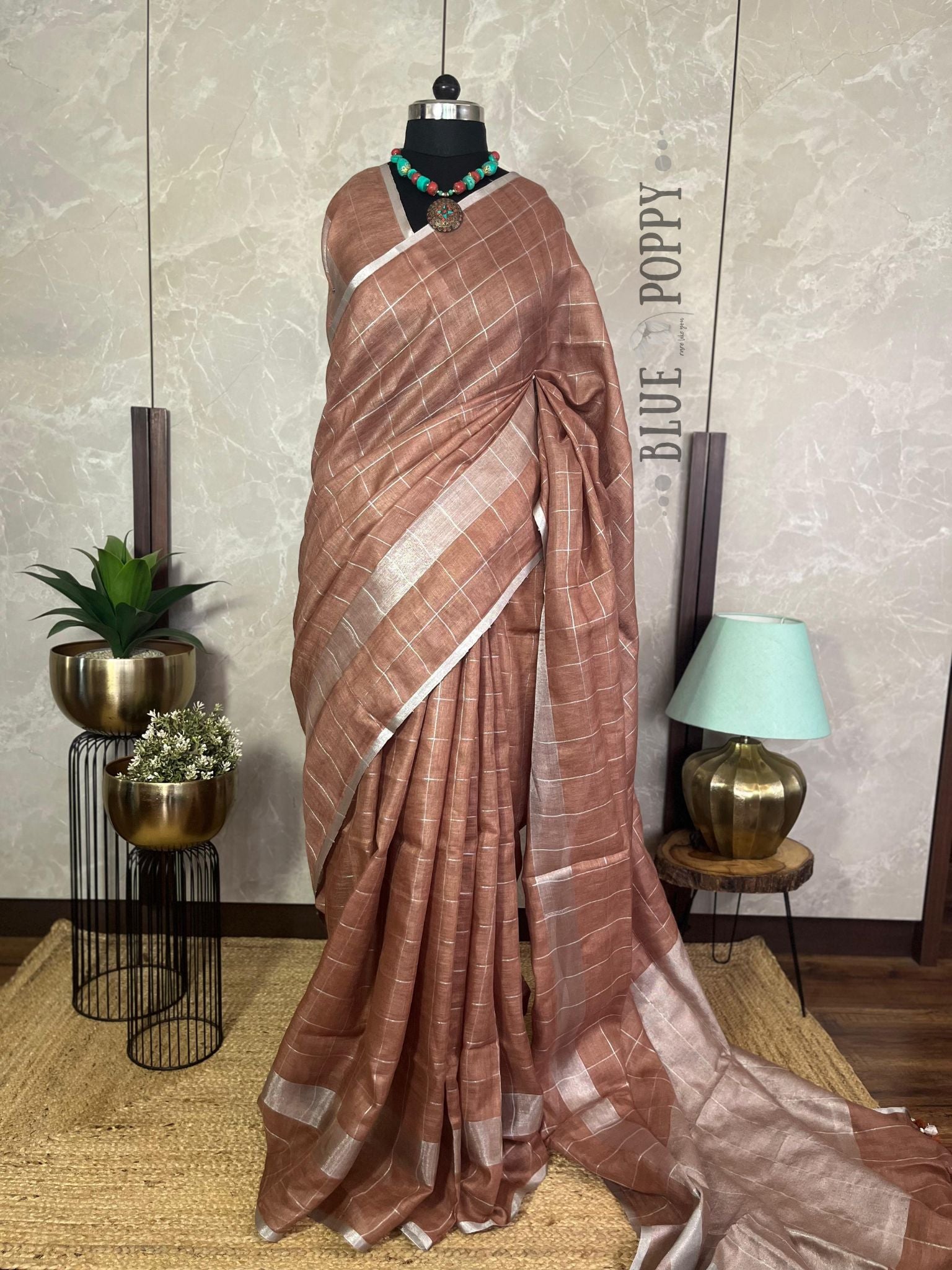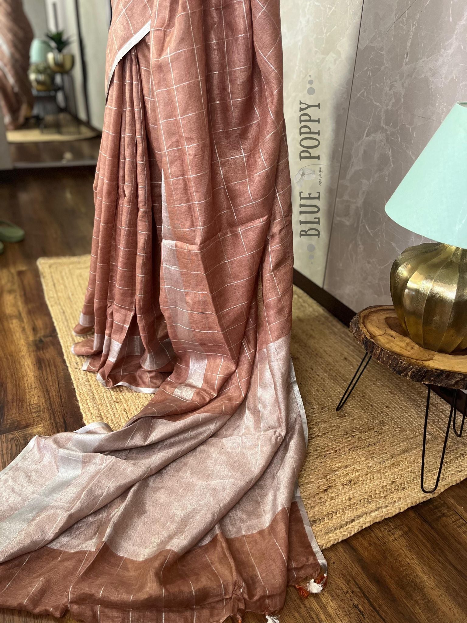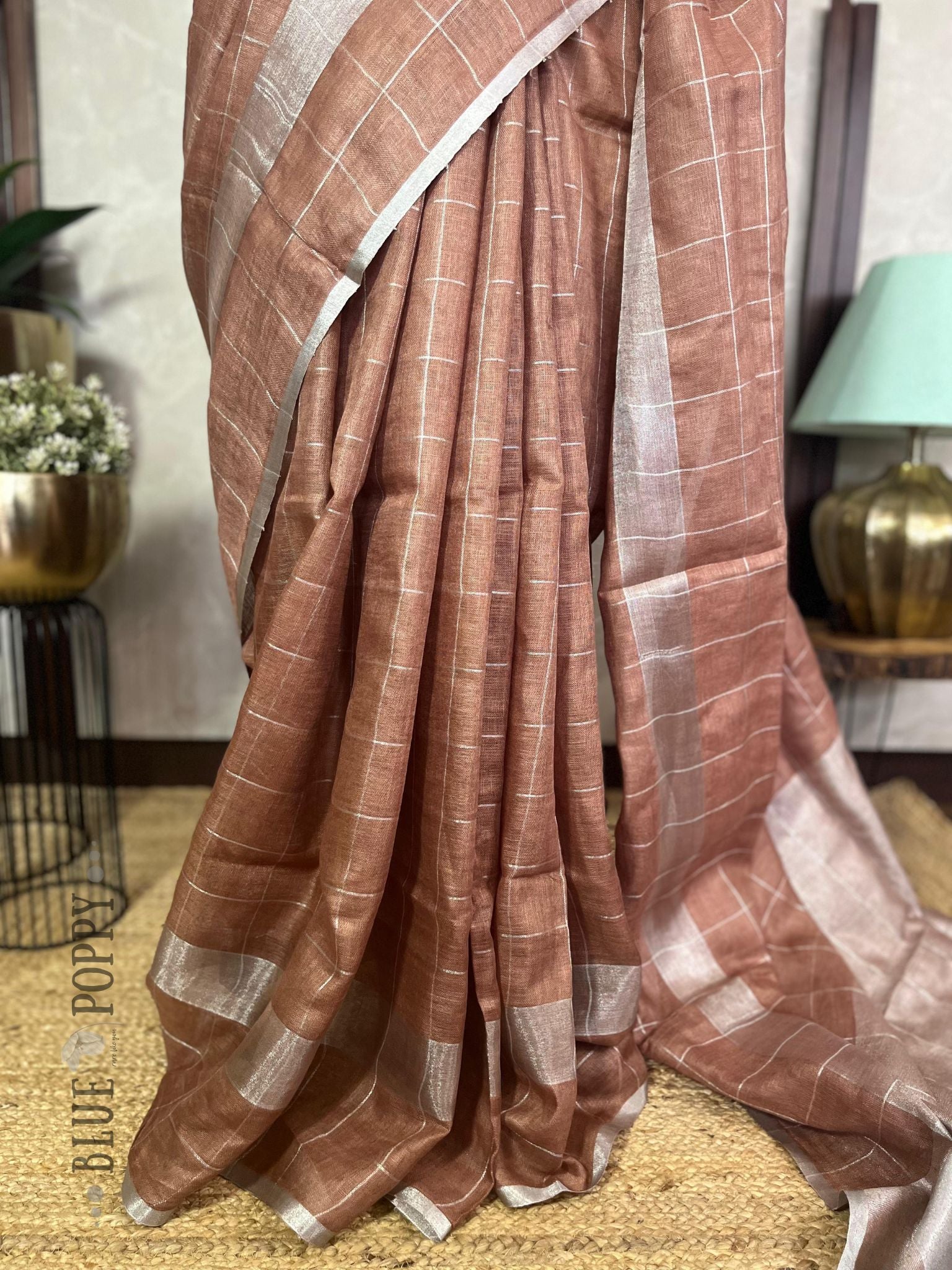 Step into effortless elegance with the Rustic Weave pure linen saree in a sophisticated rust hue. This solid saree, adorned with delicate zari checks, is your perfect partner for both boardroom meetings and brunch dates. Super comfy and stylish, it lets you shine all day long—because looking gorgeous should never be hard work!